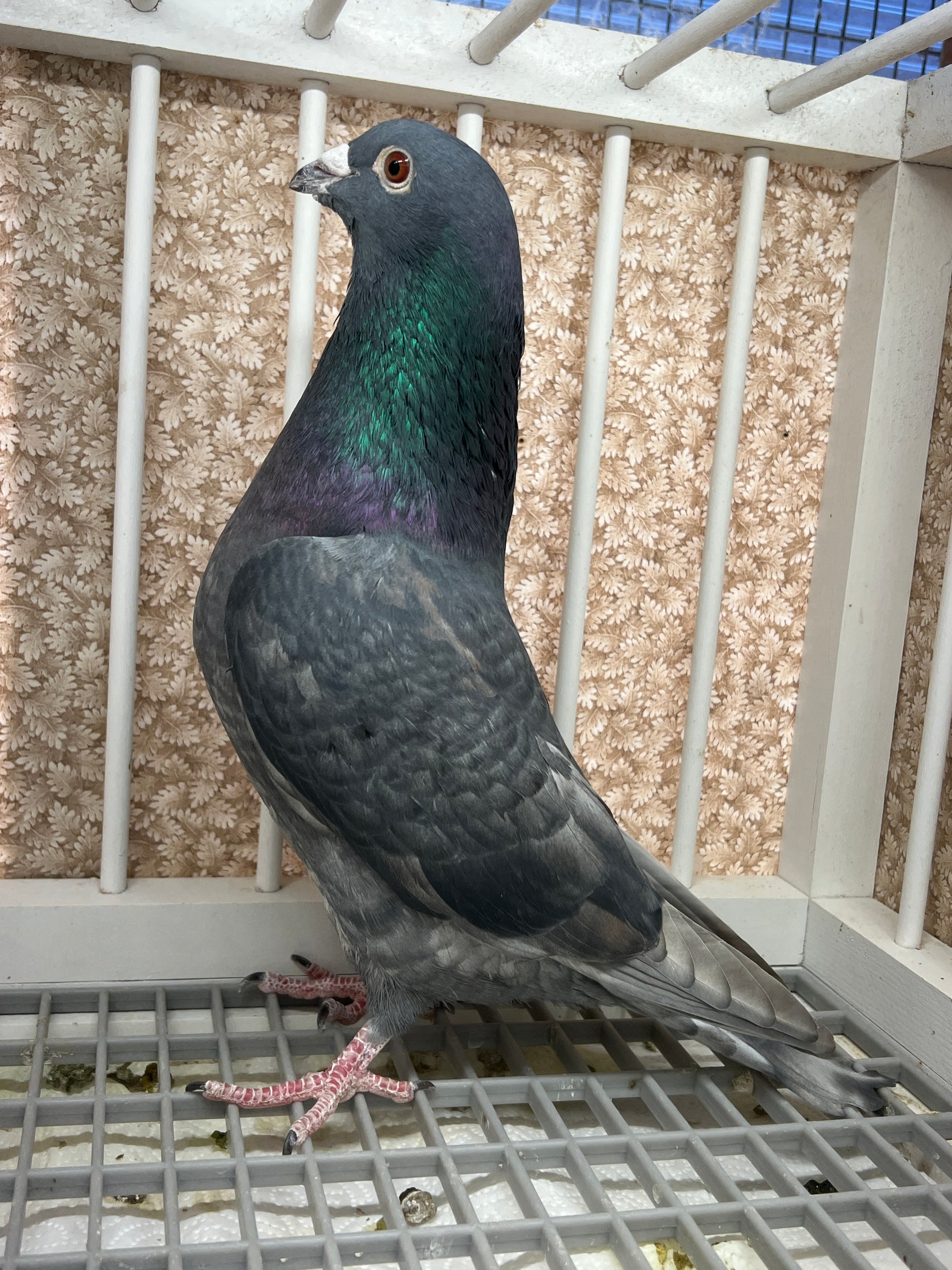 This unique color specimen isn't found very often for sale in the United States. Its ancestors were imported from the Netherlands as the Rubella color was previously unavailable in the USA. With strong physical features and exceptional feather quality, this young racing pigeon is sure to captivate any onlooker.